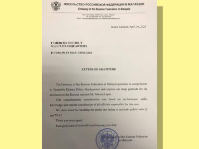 淡马鲁警方协助俄罗斯男子 大使馆致函感谢赞扬